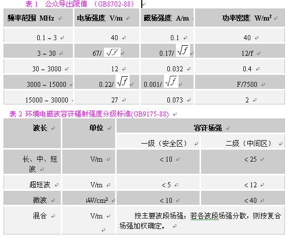 在對一般環(huán)境的電磁輻射分析中,應(yīng)主要選用《環(huán)境電磁波衛(wèi)生標(biāo)準(zhǔn)》主要選用《環(huán)境電磁波衛(wèi)生標(biāo)準(zhǔn)》(GB9175-88),根據(jù)輻射源的主要輻射頻率,參照表2,找到其輻射強(qiáng)度限值。注意掌握三個標(biāo)準(zhǔn)限值,一般我們把居民居住的環(huán)境按一級安全區(qū)處理,則其標(biāo)準(zhǔn)限值為:在長、中、短波,電場強(qiáng)度應(yīng)小于10V/m;在超短波段,電場強(qiáng)度應(yīng)小于5V/m;在微波波段,其輻射功率密度應(yīng)小于10μW/cm2。考慮到對在電磁輻射環(huán)境內(nèi)工作人員的保護(hù),我們建議在職業(yè)安全衛(wèi)生領(lǐng)域,采用《電磁輻射防護(hù)規(guī)定》(GB8702-88)的相應(yīng)限值。